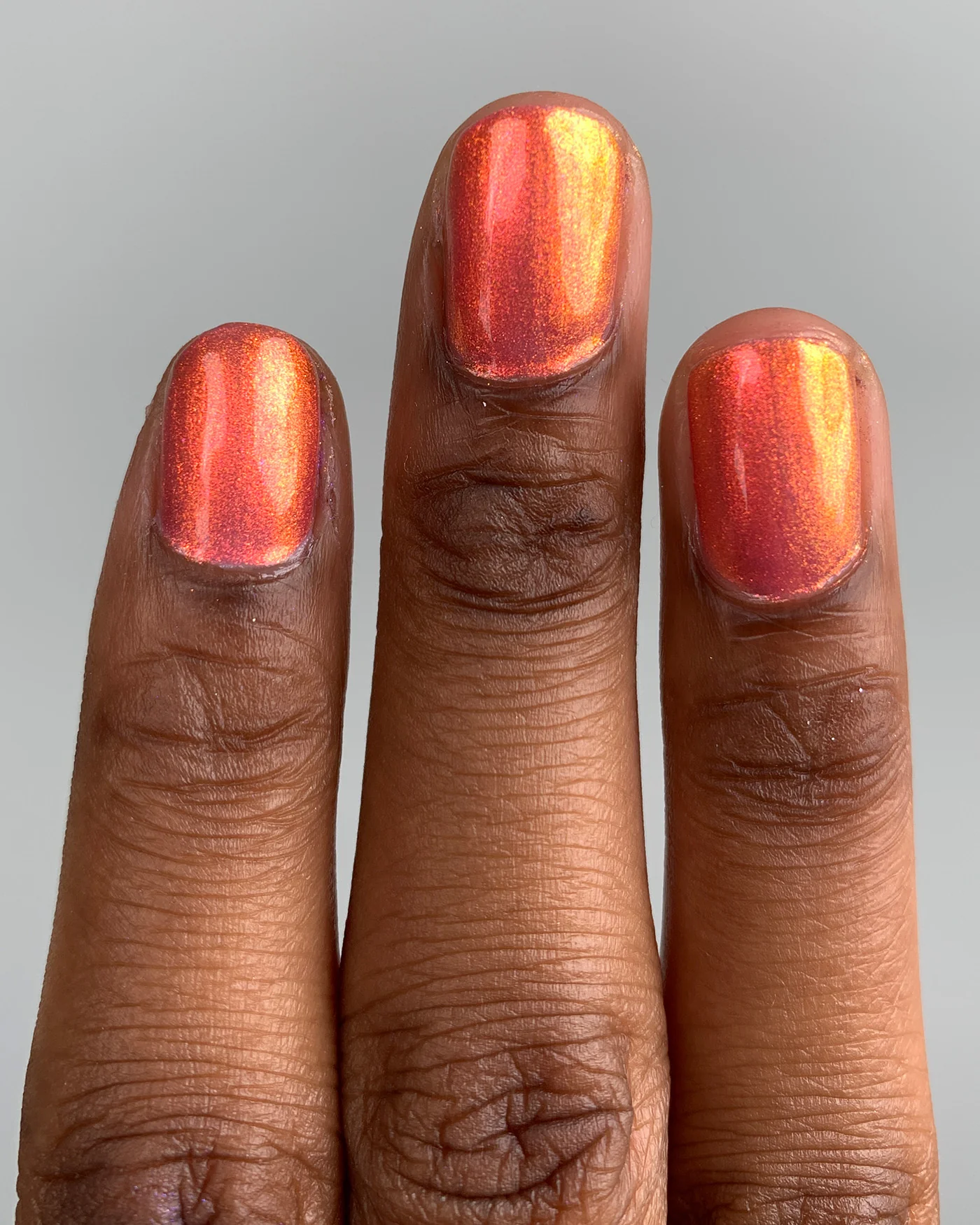 STOLEN AMBROSIA is a coral lacquer filled with orange and yellow shimmer. from the UNDERWORLD SET.