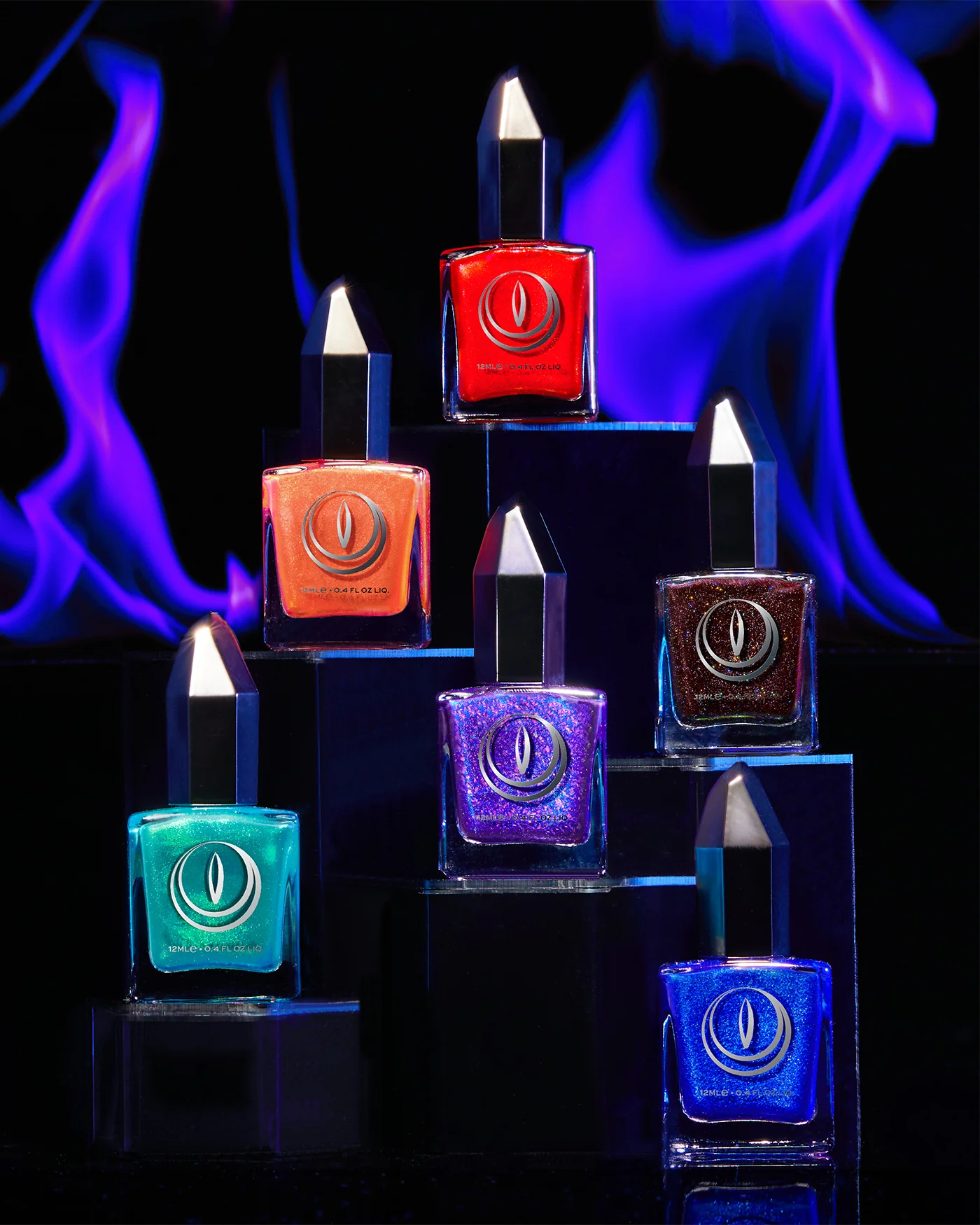 indulge in a few positively infernal delights. freshly plucked from the darkest depths of the invisible realm, comes 6 dreadfully divine new shimmers and flakies - some of the most devilishly shifty and sublimely glowy shades our galaxy has ever seen. unbottle the chaos and allow your claws to sink fully into the depths of each shade’s discordian mischief.the UNDERWORLD SET includes 6 special effect lacquers: